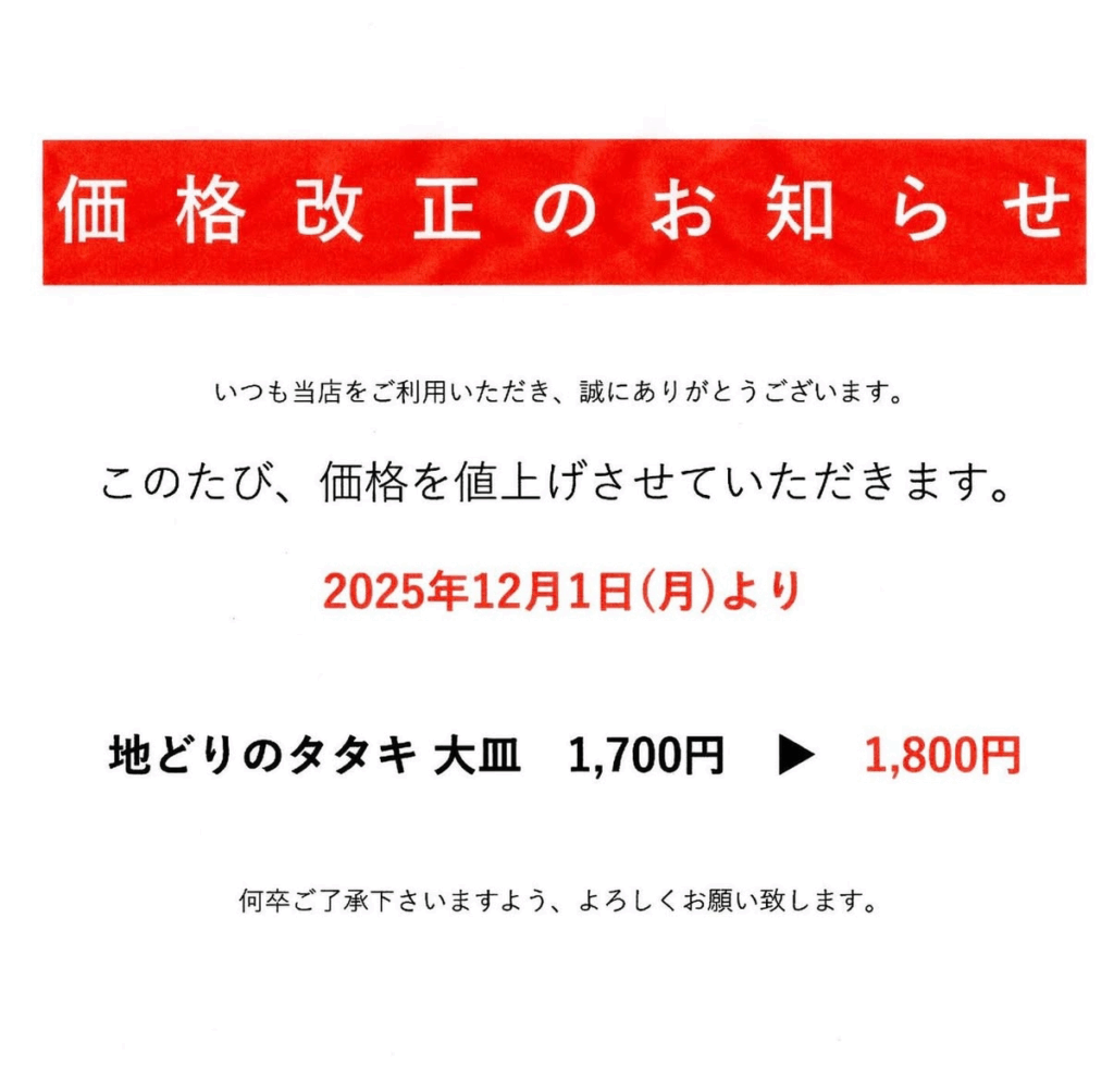 原材料及び人件費の高騰のため、2025年12月1日より、「地どりのタタキ(大皿)」の価格改正を行います。